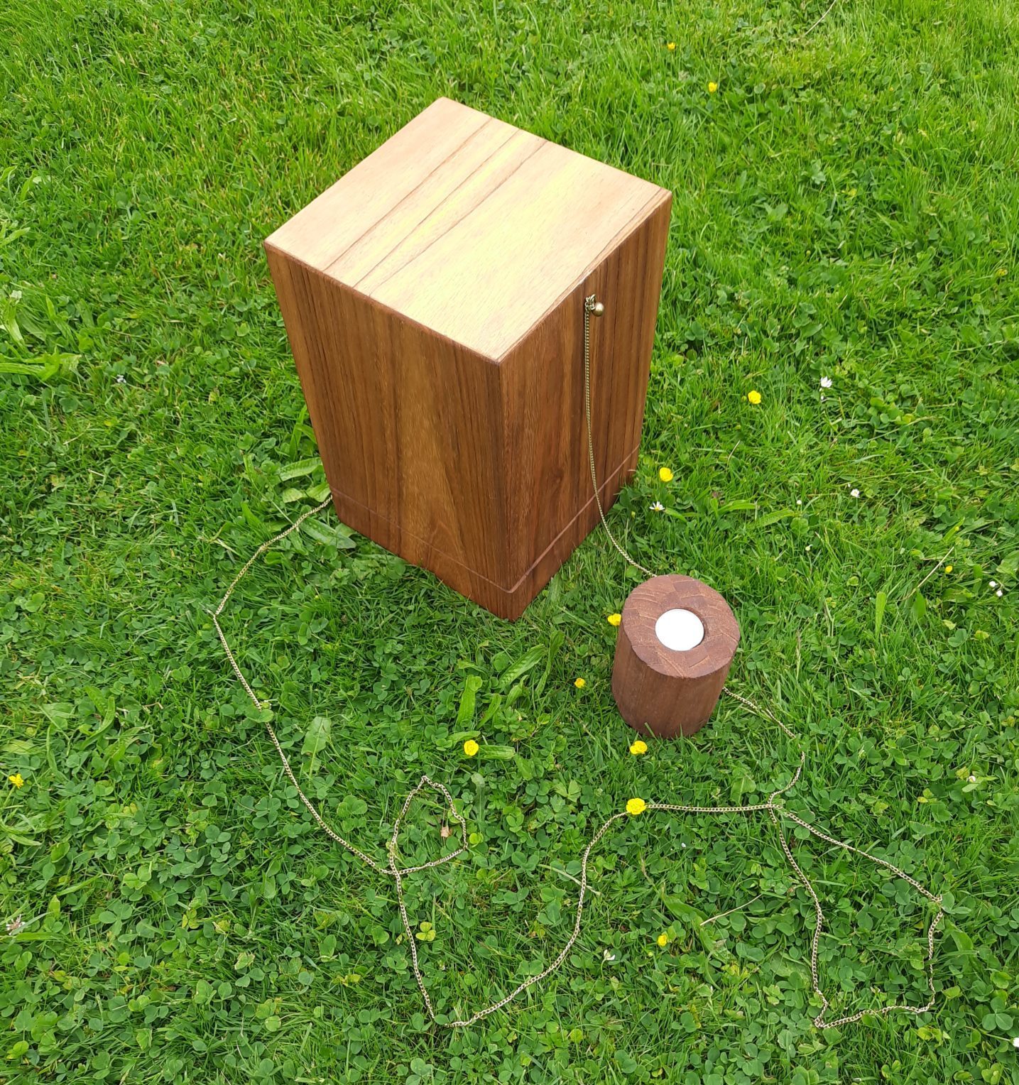 das Holz, die Form, die Oberfläche, die Farbe, zusätzliche Verzierungen, ein Wappen, sowie das Seil, die Kette, ein Lederriemen: alle Komponenten können nun frei gewählt werden. Da ich dieses Nebengewerbe als kreatives Hobby betreibe, ist eine Fertigungszeit von drei Monaten für so eine Urne als realistisch einzuschätzen. Unten im Bild eine Esche mit eingefrästen Schwalben aus Eiche und passendem Teelichthalter aus dem Kern der Esche.