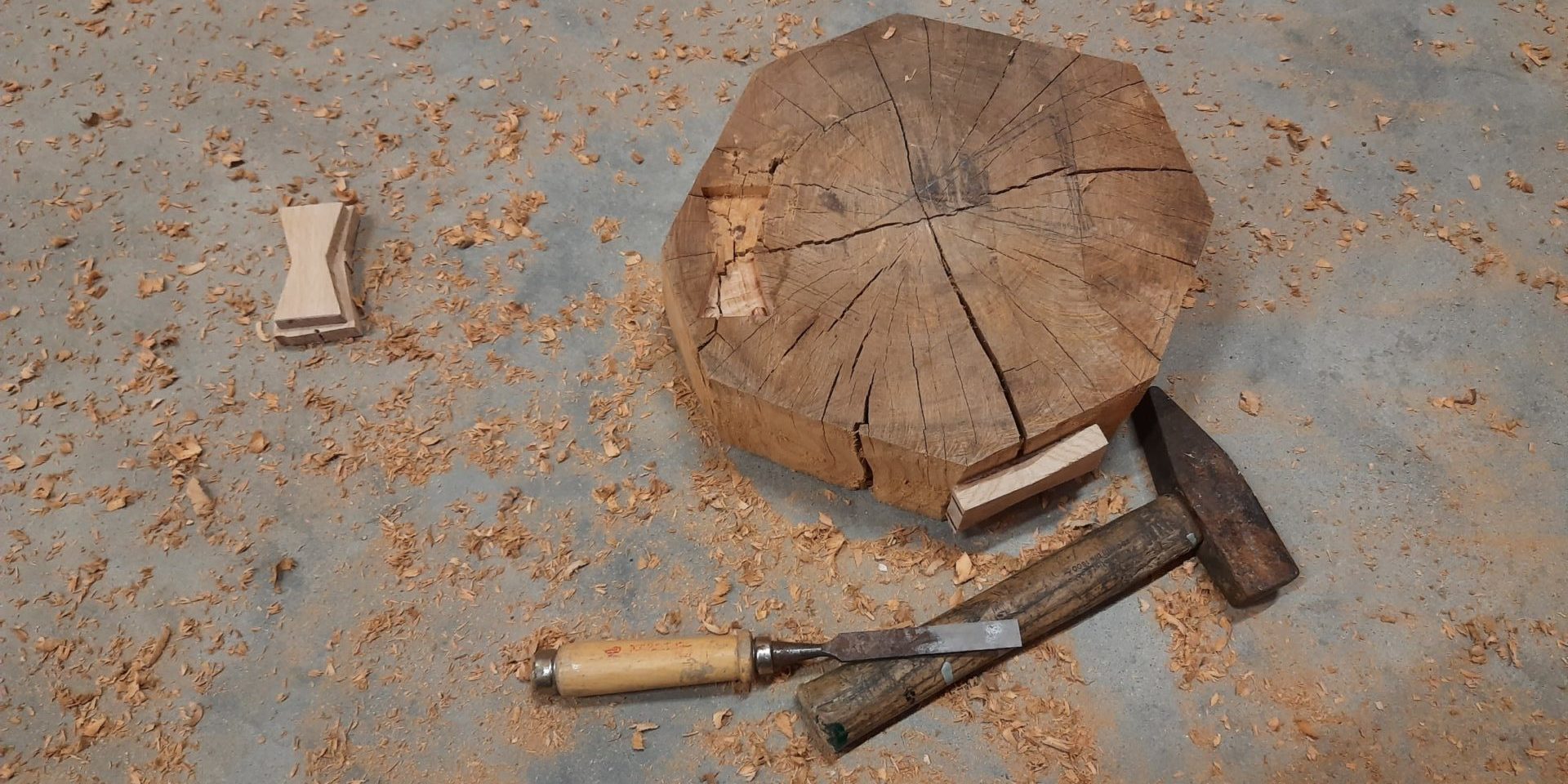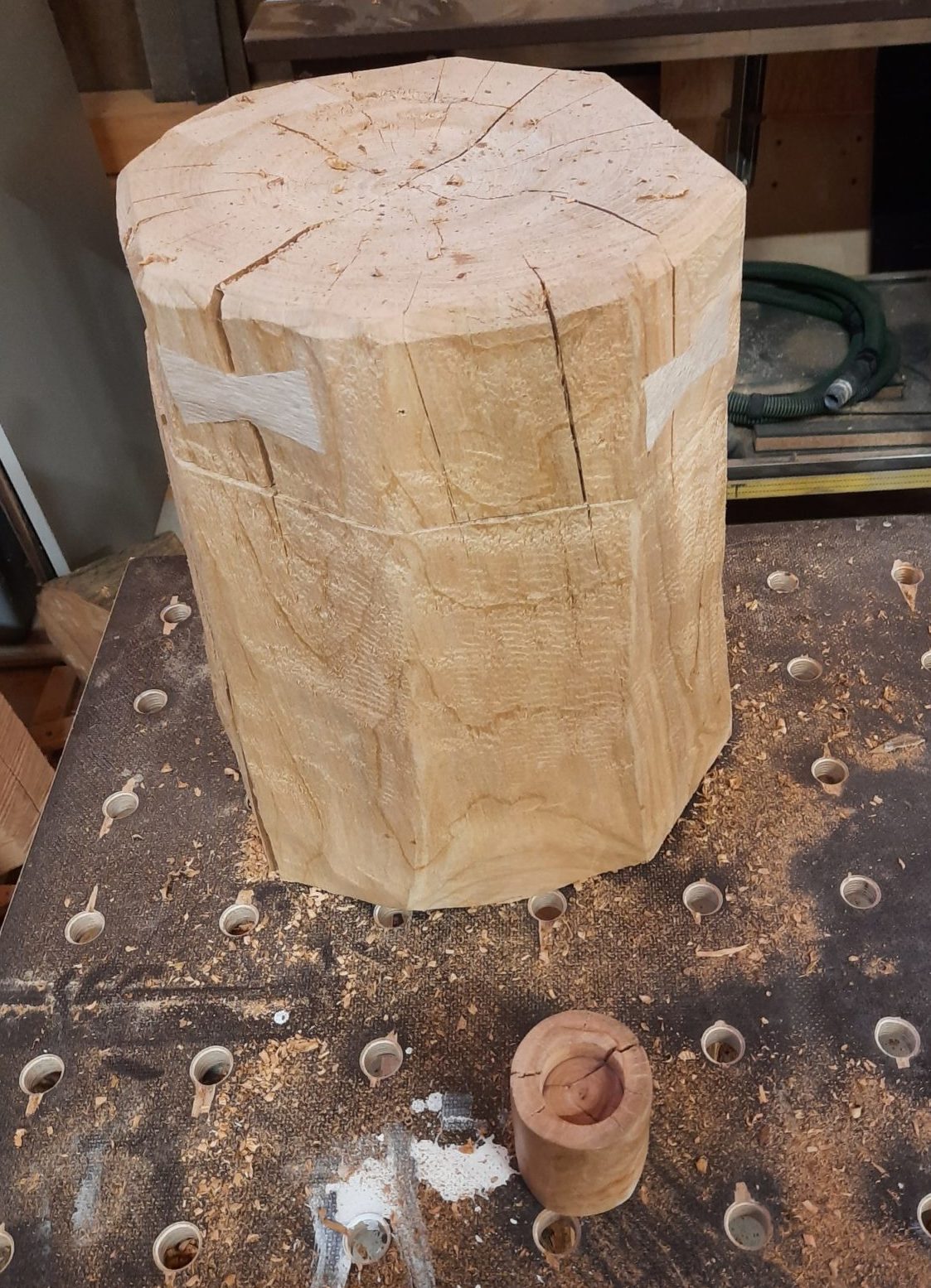 Die Form der Urne ist fast vollendet. Schwalben sind aus Eiche für die groben Risse eingefräst & geleimt worden, um tiefes Reißen des Stamms durch die Trocknung zu verlangsamen. Es fehlen noch das Tau & das Oberflächenfinish mit Schleifarbeiten & Öl.